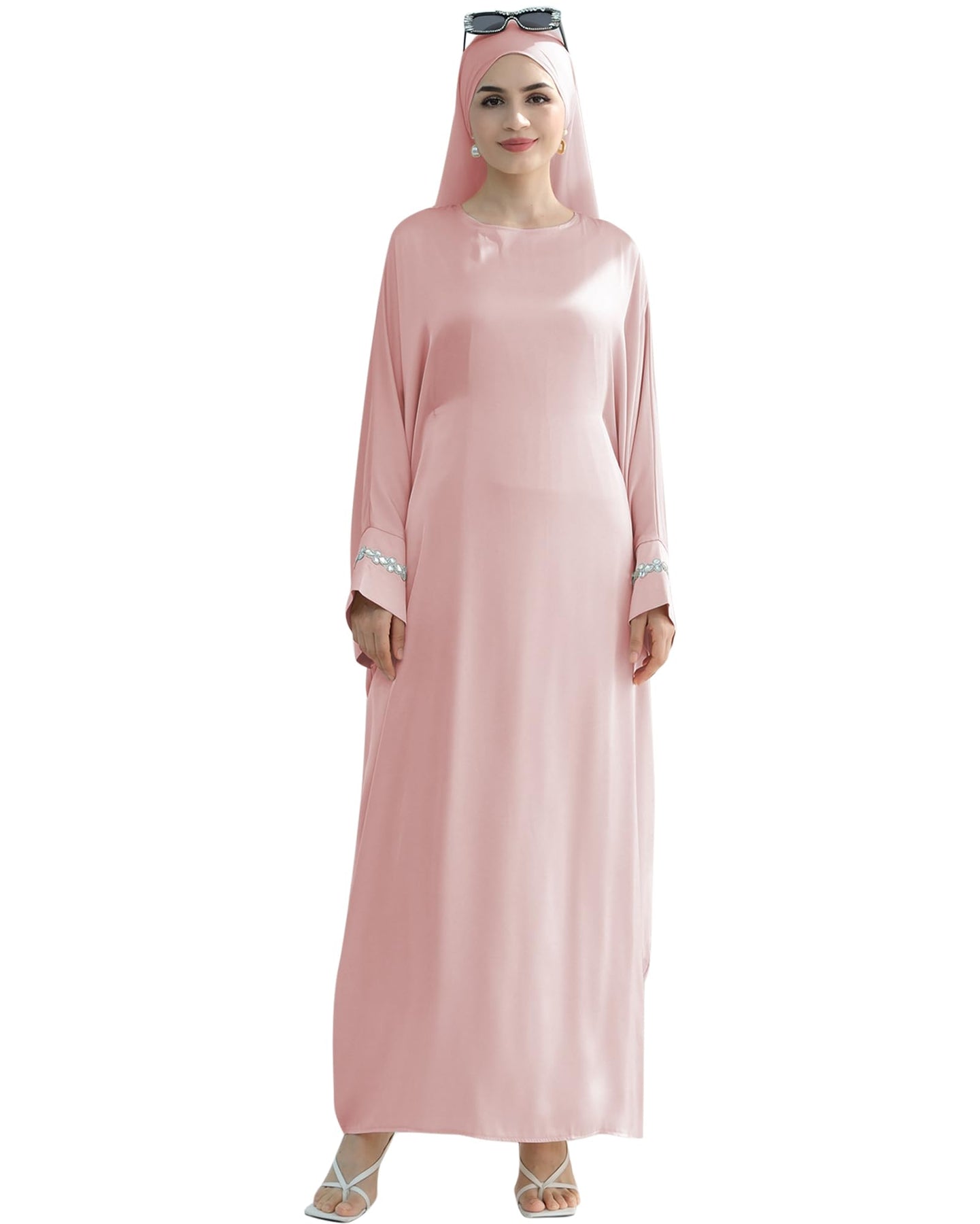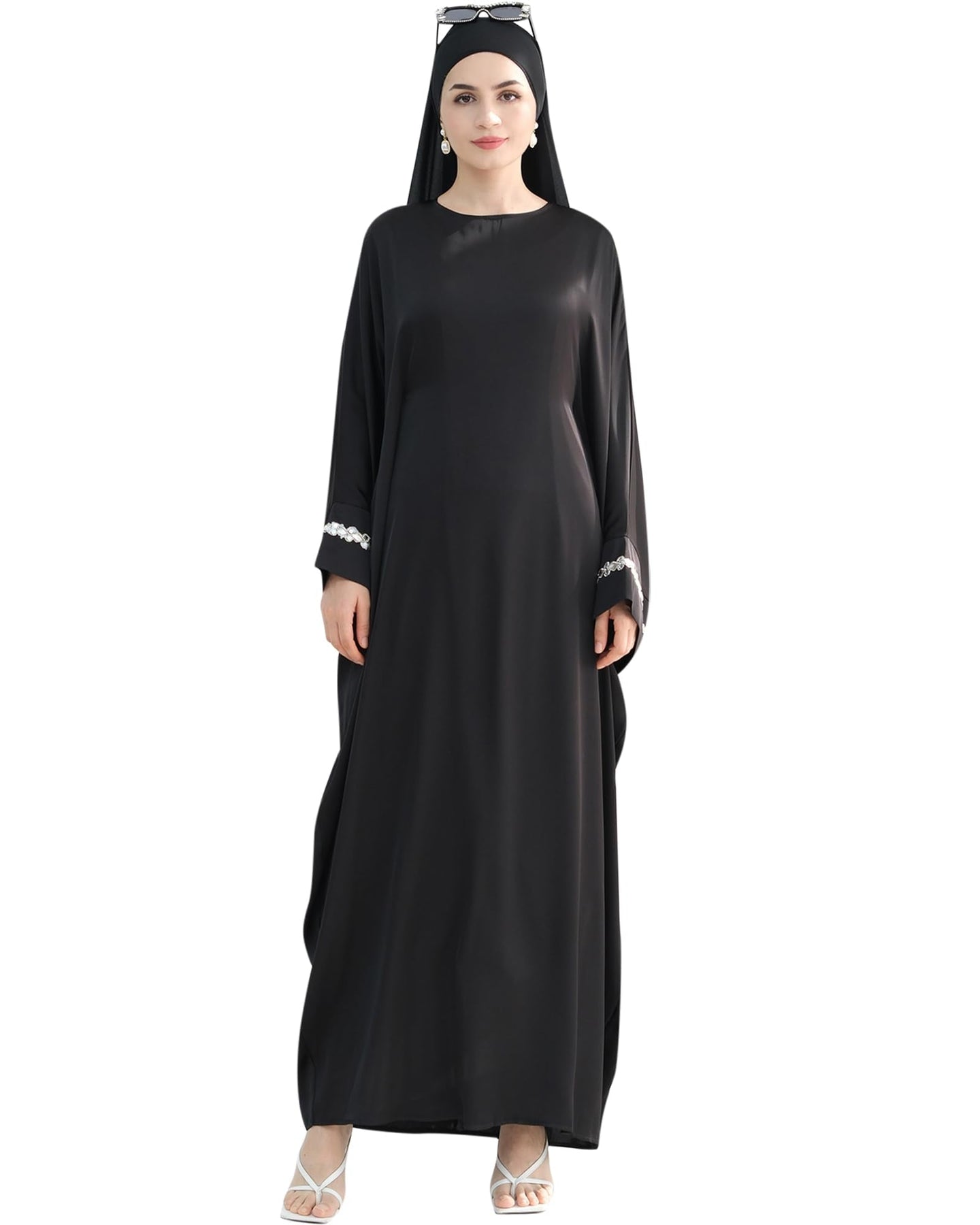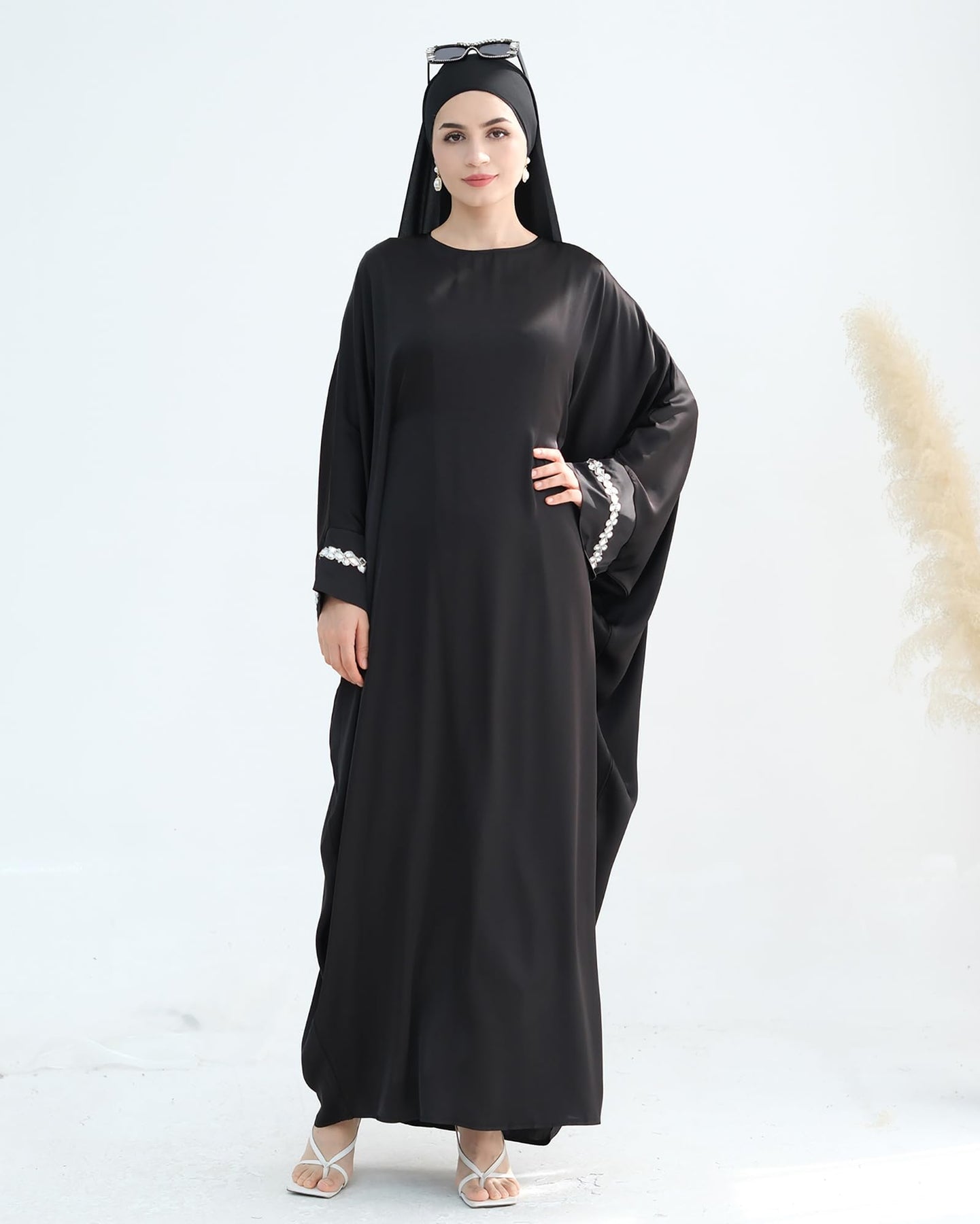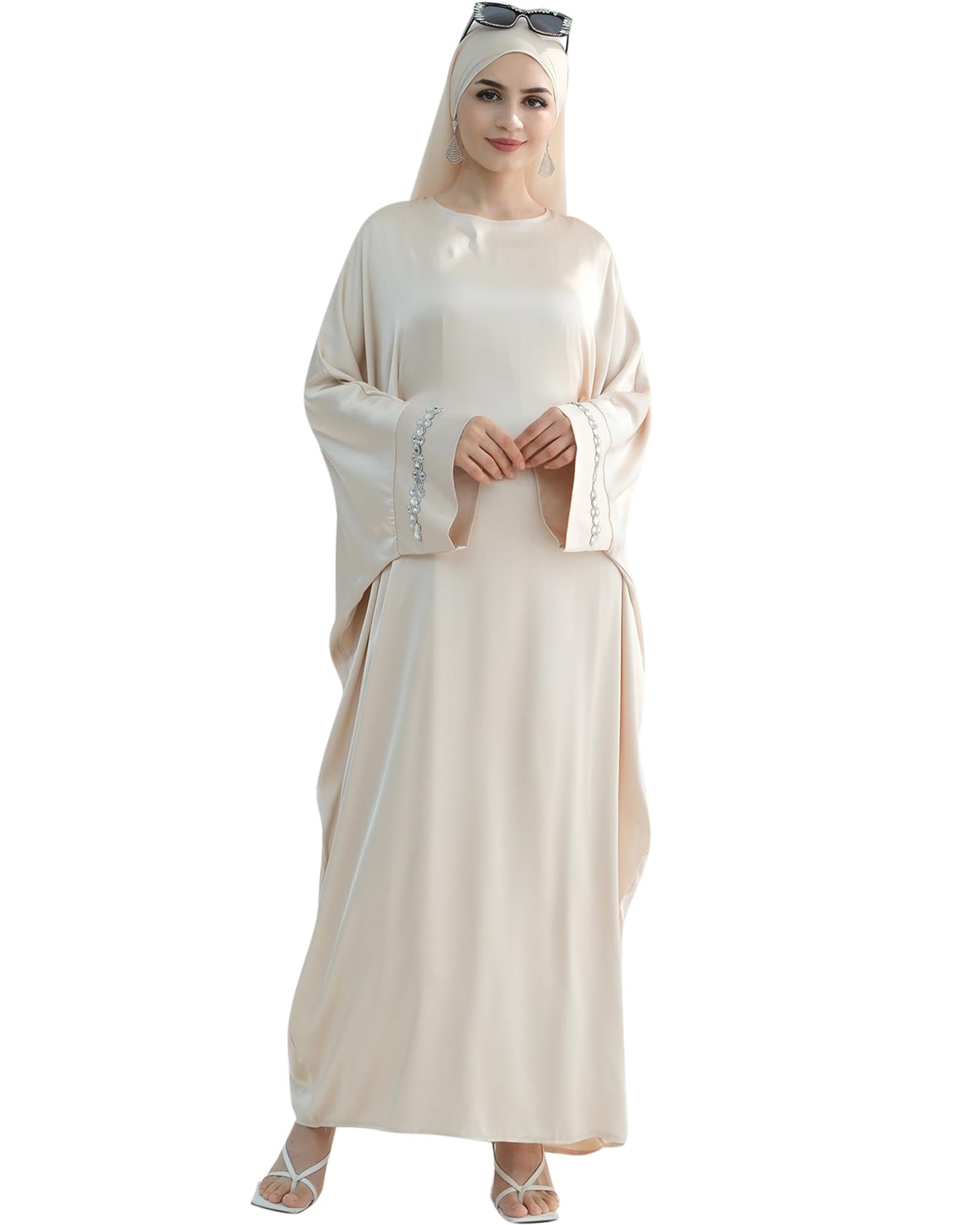 Solid Color Batwing Sleeve Abaya with Handcrafted Chain Beading, Hidden Waistband Modest Muslim Robe Prayer Dress Zohir Store