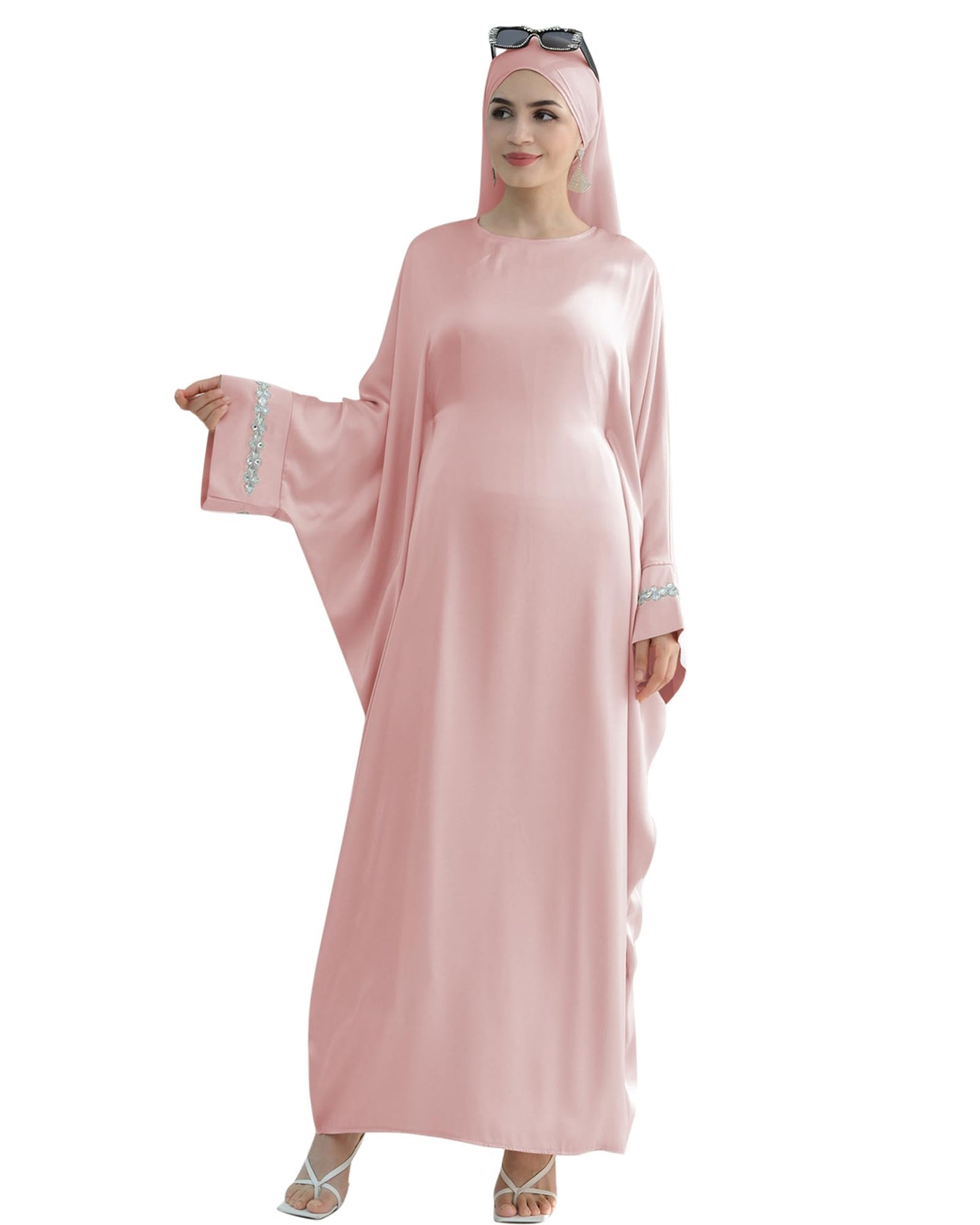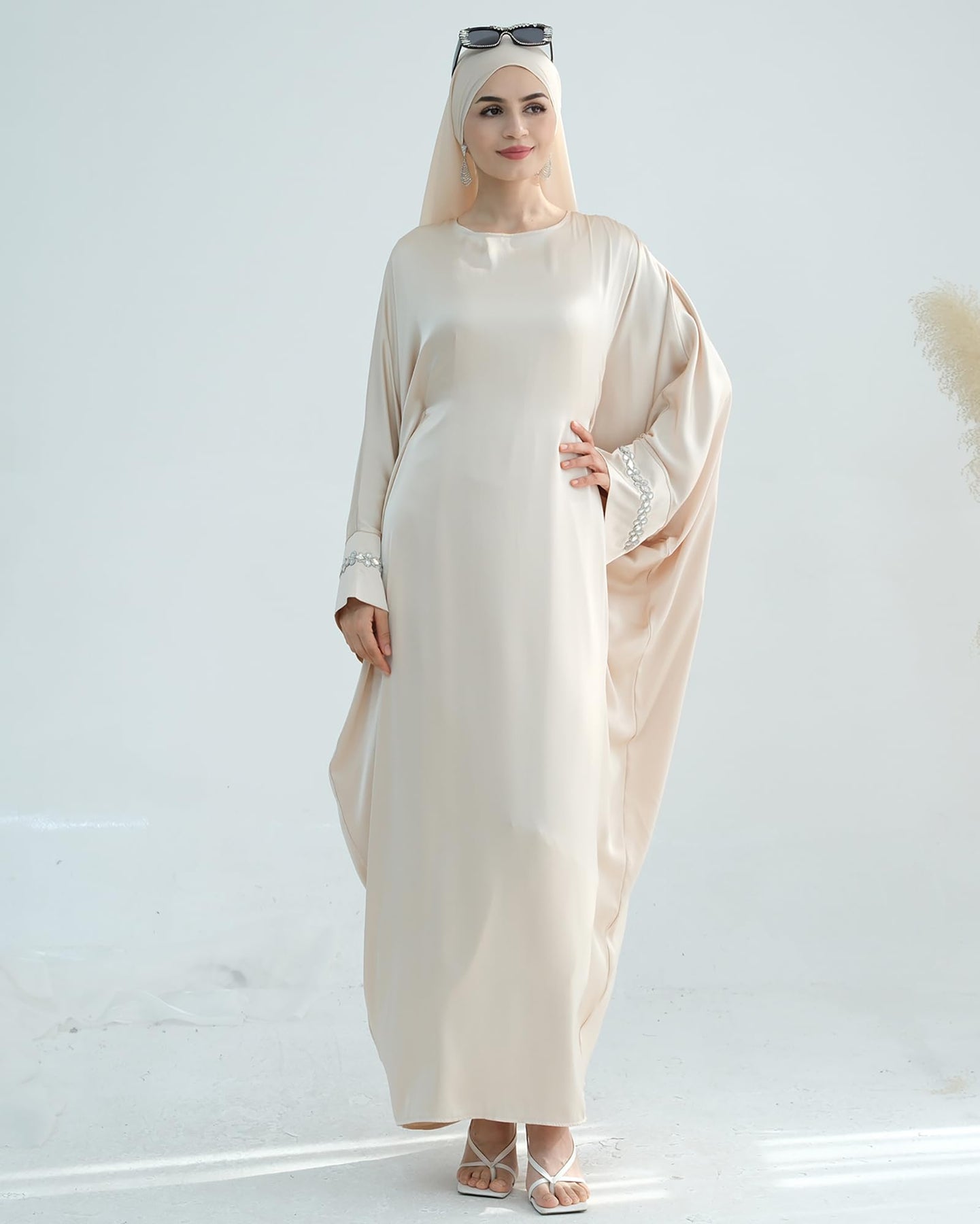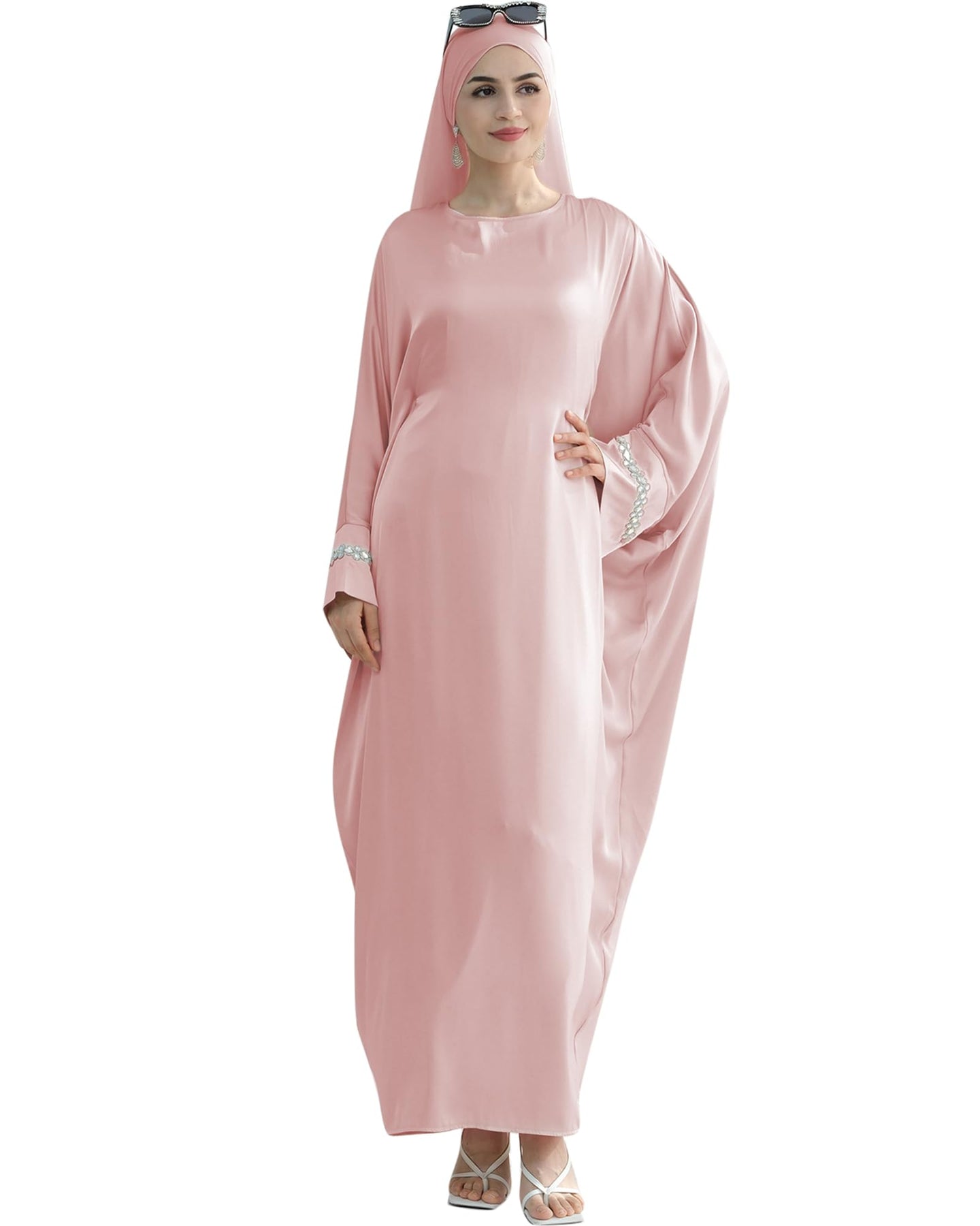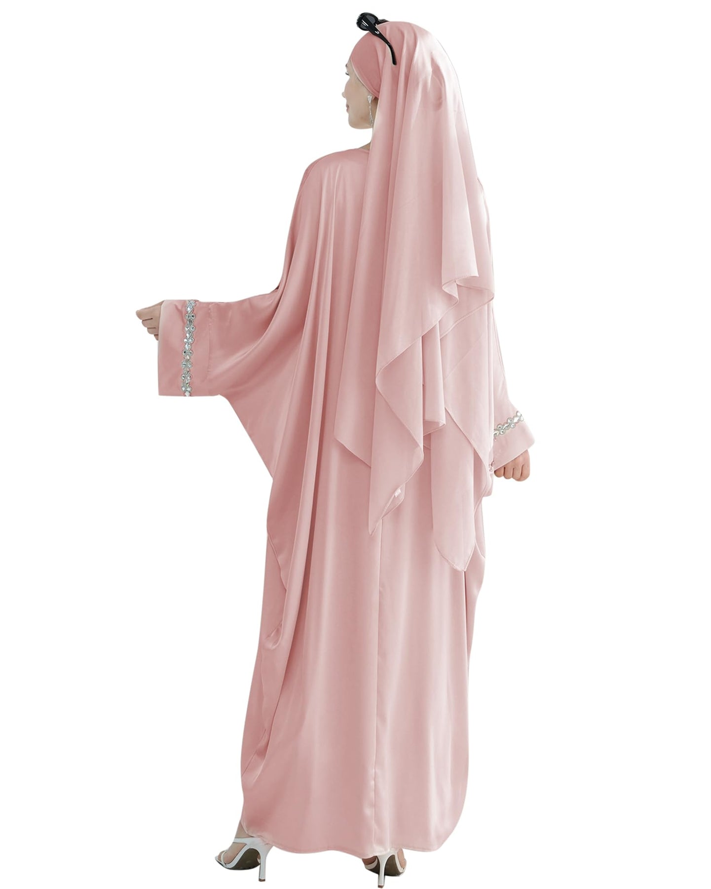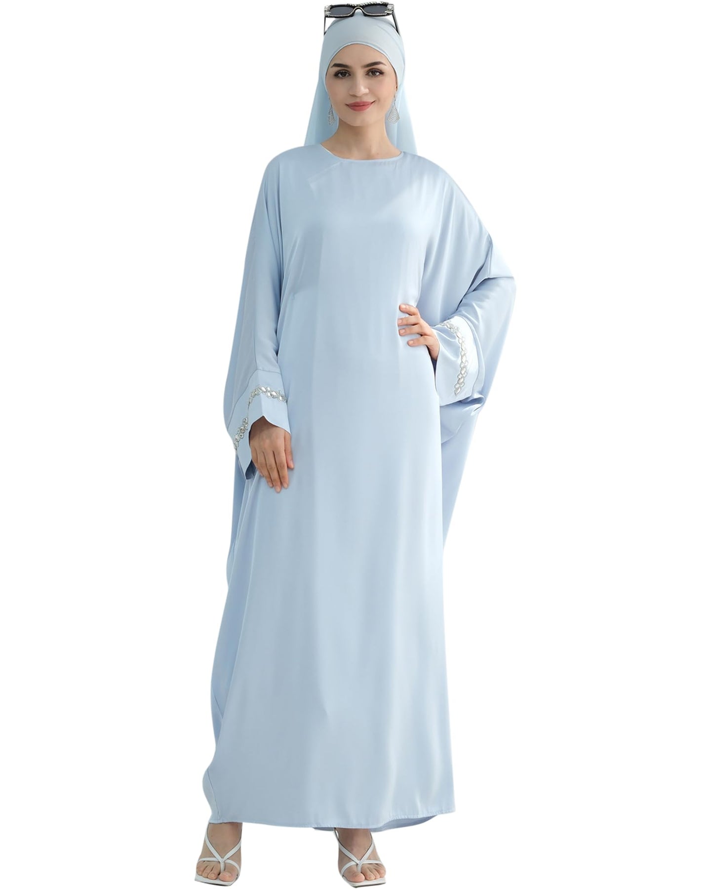 Solid Color Batwing Sleeve Abaya with Handcrafted Chain Beading, Hidden Waistband Modest Muslim Robe Prayer Dress Zohir Store