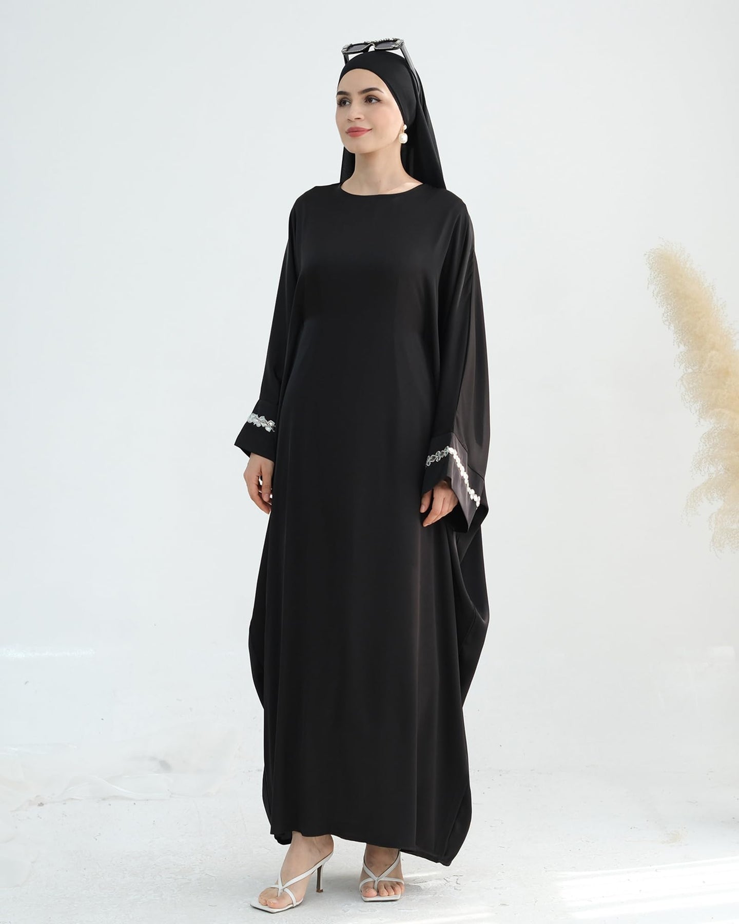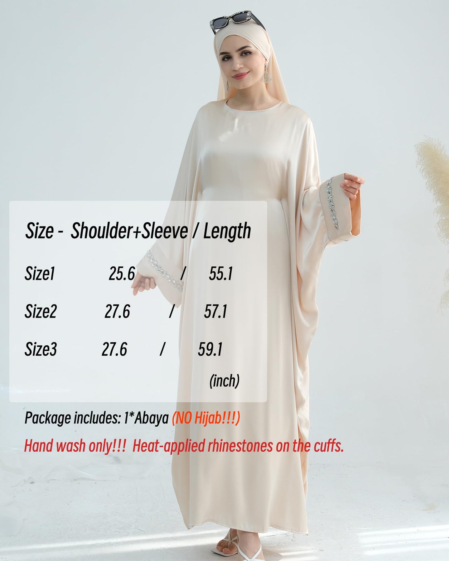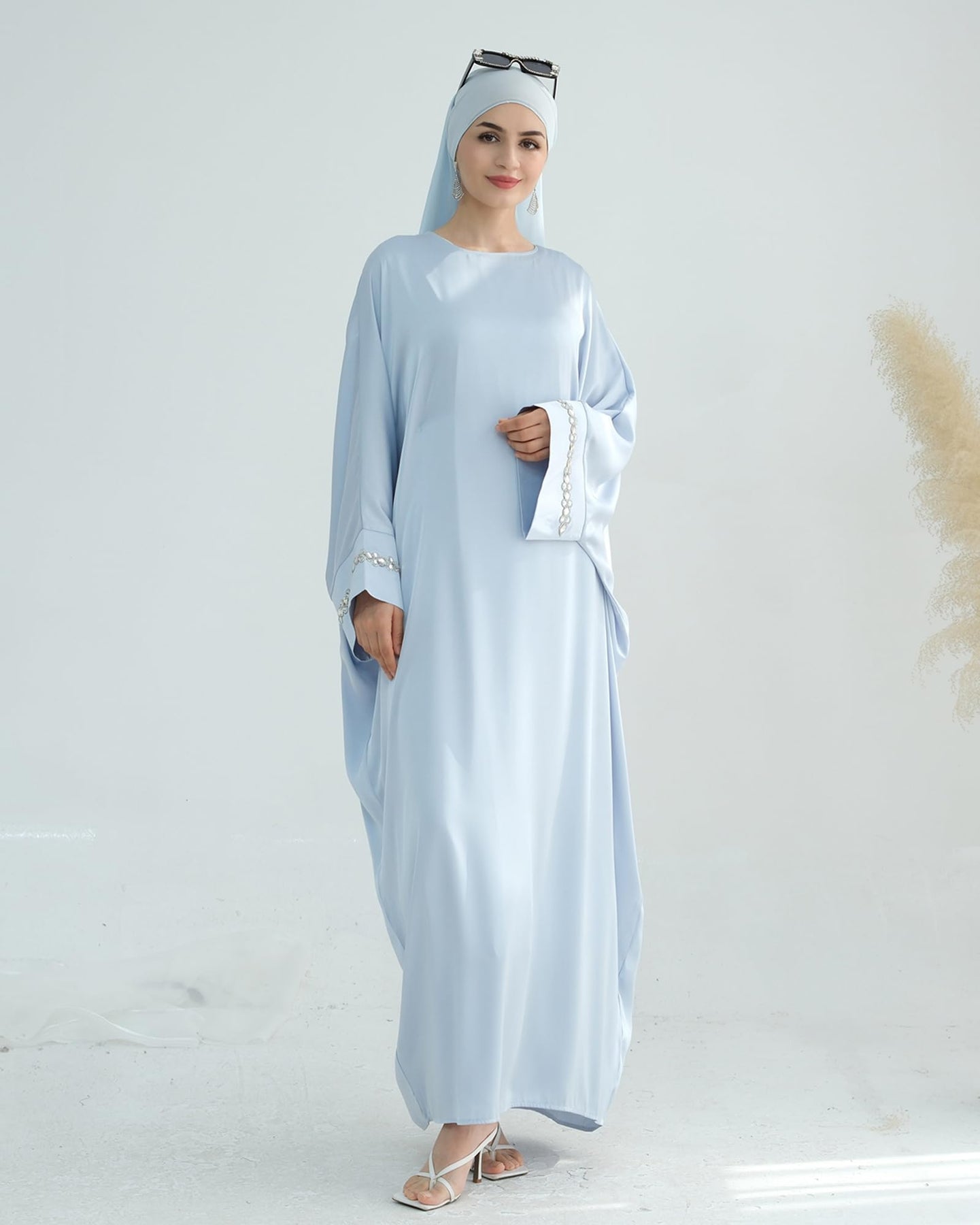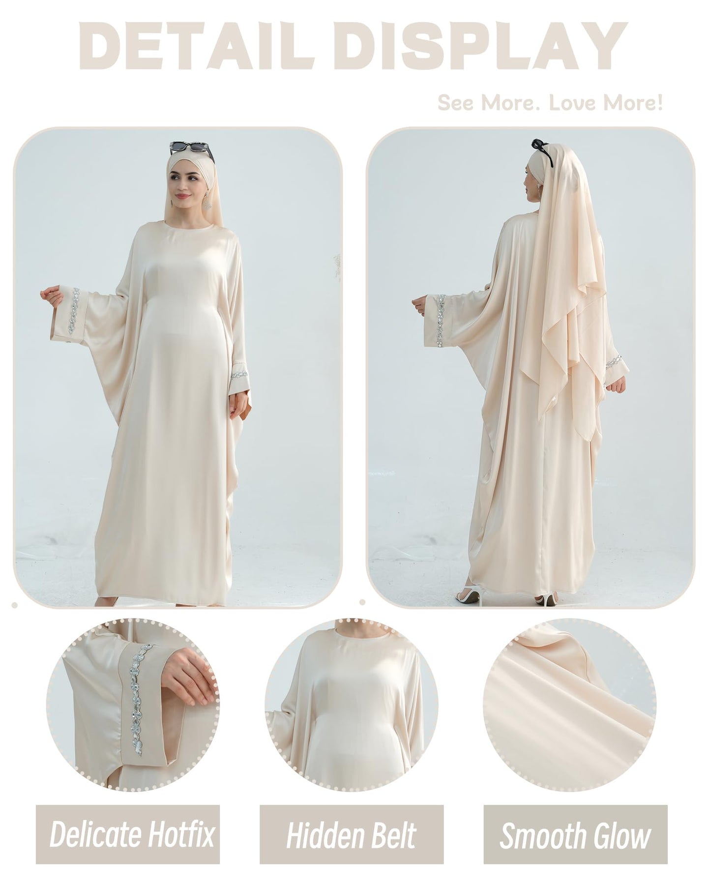 Solid Color Batwing Sleeve Abaya with Handcrafted Chain Beading, Hidden Waistband Modest Muslim Robe Prayer Dress Zohir Store