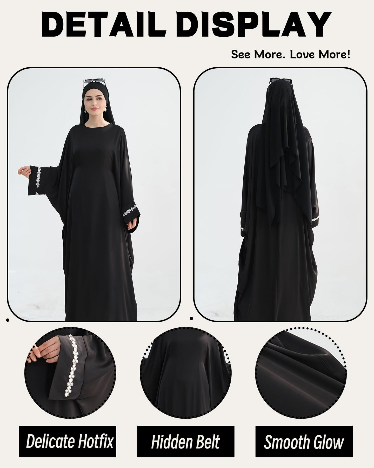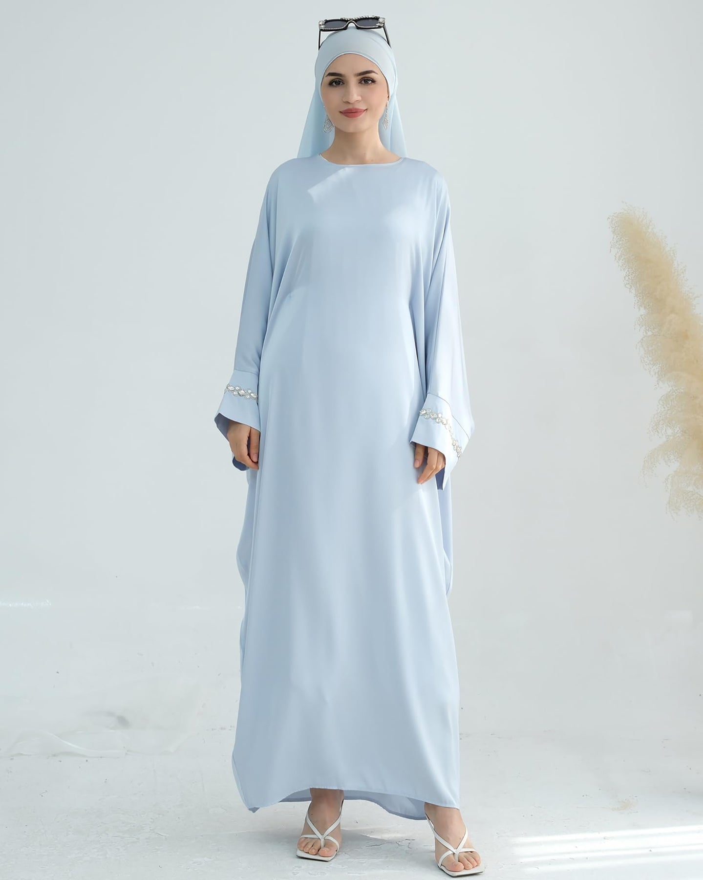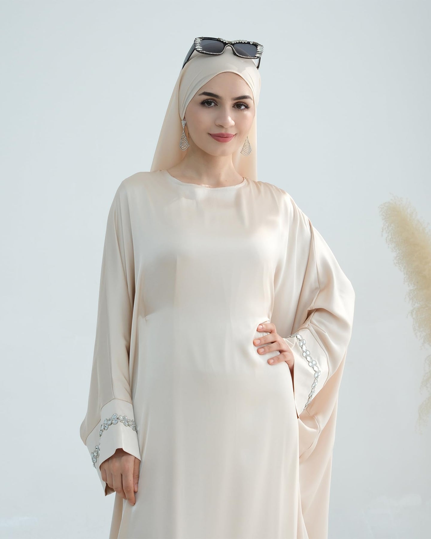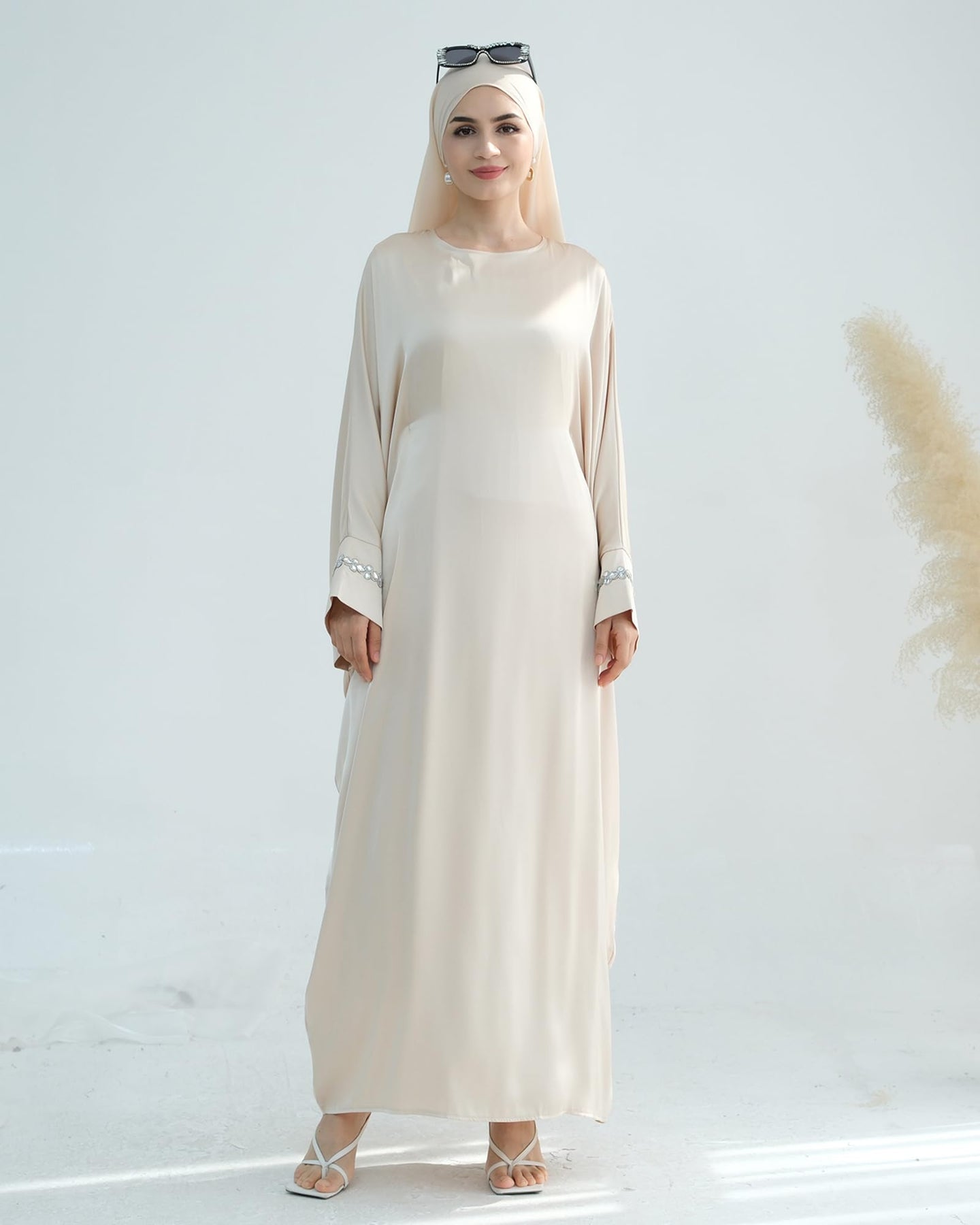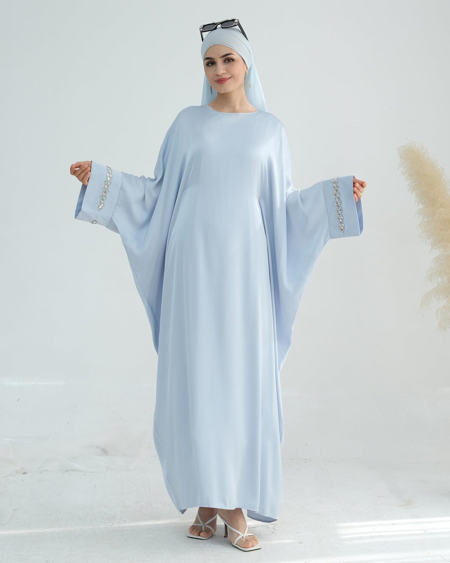 Solid Color Batwing Sleeve Abaya with Handcrafted Chain Beading, Hidden Waistband Modest Muslim Robe Prayer Dress Zohir Store
